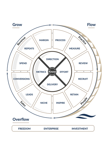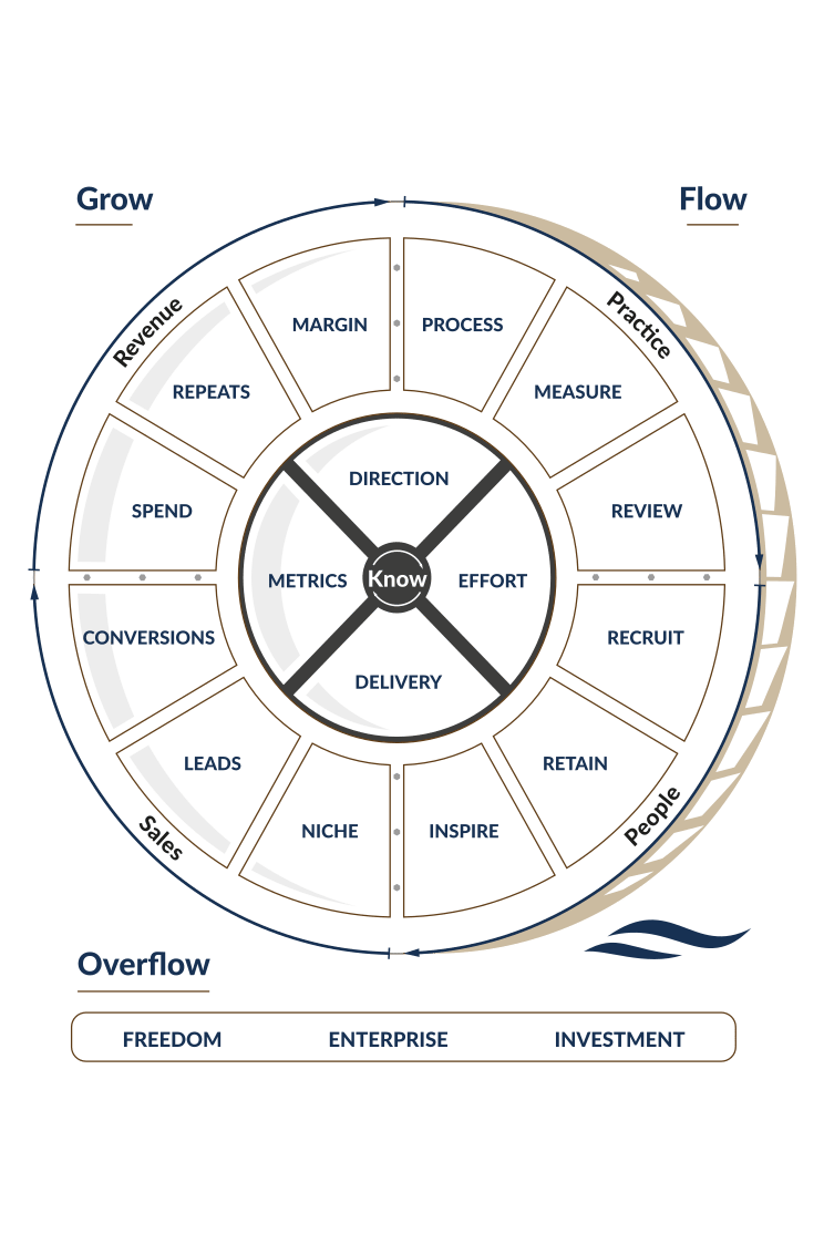 Our comprehensive Business Waterwheel™ gives us a clear guaranteed business growth model, allowing our clients to truly ‘KNOW’ their strengths and weaknesses, sustainably ‘GROW’ their customer base and profits, improve the efficient ‘FLOW’ of their business, and ultimately achieve ‘OVERFLOW’; a state where the business generates an income, whether they work there or not.